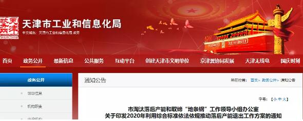 4月10日,天津市工業(yè)和信息化局網(wǎng)站發(fā)布《天津市2020年利用綜合標準依法依規(guī)推動落后產(chǎn)能退出的工作方案》(以下簡稱《方案》)。該《方案》提出將以鋼鐵、水泥、電解鋁、平板玻璃、造紙等行業(yè)為重點嚴格按照綜合標準依法依規(guī)有序推進,促使一批能耗、環(huán)保、安全、質量、技術達不到標準和生產(chǎn)不合格產(chǎn)品或淘汰類產(chǎn)能依法依規(guī)關停退出,嚴防“地條鋼”死灰復燃,促進環(huán)境質量持續(xù)改善,產(chǎn)業(yè)結構持續(xù)優(yōu)化。