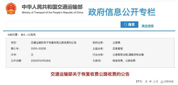 一、交通運輸部關于恢復收費公路收費的公告 經國務院同意,恢復全國收費公路收費。現將有關事宜公告如下: 一、恢復收費時間。自2020年5月6日零時起,經依法批準的收費公路恢復收費(含收費橋梁和隧道)。 二、繼續落實法定免費通行政策。符合《收費公路管理條例》及相關規定的軍隊車輛(含武警部隊車輛),公安機關在轄區內收費公路上處理交通事故、執行正常巡邏任務和處置突發事件的統一標志的制式警車,懸掛應急救援專用號牌的國家綜合性消防救援車輛,經國務院交通主管部門或者省、自治區、直轄市人民政府批準執行搶險救災任務的車輛,鮮活農產品運輸車輛,進行跨區作業的聯合收割機和運輸聯合收割機(包括插秧機)的車輛,繼續享受免收車輛通行費政策。 三、保障疫情防控應急運輸車輛優先便捷通行。新冠肺炎疫情防控常態化期間,高速公路收費站設置專用快捷通道,加強現場通行秩序引導維護,保障疫情防控等應急運輸車輛優先便捷通行。 特此公告。 交通運輸部 2020年4月28日 二、解讀 | 收費公路恢復收費若干問題問答 為統籌疫情防控和經濟社會發展,經國務院同意,從2020年2月17日零時起,全國收費公路免收車輛通行費。免費政策實施以來,各地交通運輸主管部門和收費公路經營管理單位堅決服從疫情防控大局,采取有力有效措施,免費不免服務,有力促進了疫情防控、復工復產和經濟社會秩序恢復,取得良好社會效果。 經國務院同意,從5月6日零時起,全國收費公路將恢復收費,現將大家比較關心的一些問題簡要介紹如下: 。薄⑹召M公路從什么時候開始恢復收費? 經國務院同意,從2020年5月6日零時起,經依法批準的收費公路恢復收取車輛通行費。其中,開放式收費高速公路和普通公路以車輛通過收費站收費車道的時間為準,封閉高速公路以車輛通過出口車道的時間為準。符合《收費公路管理條例》及相關規定的軍隊車輛(含武警部隊車輛),公安機關在轄區內收費公路上處理交通事故、執行正常巡邏任務和處置突發事件的統一標志的制式警車,經國務院交通主管部門或者省、自治區、直轄市人民政府批準執行搶險救災任務的車輛,鮮活農產品運輸車輛,進行跨區作業的聯合收割機、運輸聯合收割機(包括插秧機)的車輛,以及懸掛應急救援專用號牌的國家綜合性消防救援車輛,繼續依法享受免交車輛通行費政策。 。病⑿鹿诜窝滓咔榉揽匚镔Y應急運輸車輛通行高速公路是否繼續享受“三不一優先”政策? 在新冠肺炎疫情防控常態化期間,對疫情防控物資運輸車輛將依法實行分類服務和保障:一是對運輸疫情防控所需救治消毒藥品、醫療救護設備器械等緊急物資的車輛,按照《突發公共衛生事件交通應急規定》(衛生部、交通部2004年第2號令),辦理《緊急運輸通行證》,繼續執行“三不一優先”政策。其中,跨省運送緊急物資的,應當使用交通運輸部統一印制的《緊急運輸通行證》;省內運送緊急物資的,可以使用省級交通行政主管部門統一印制的《緊急運輸通行證》。二是對運輸疫情防控緊急物資以外的生活、生產等物資的車輛,高速公路收費站將設置專用快捷通道,加強現場通行秩序引導維護,保障其優先便捷通行。 。、收費標準是如何確定的? 根據《收費公路管理條例》的規定,車輛通行費的收費標準,應當根據公路的技術等級、投資總額、當地物價指數、償還貸款或者有償集資款的期限和收回投資的期限以及交通量等因素計算提出。其中,政府還貸公路的收費標準,由省級交通主管部門會同同級價格主管部門、財政部門審核后,報省級人民政府審查批準;經營性公路的收費標準,由省級交通主管部門會同同級價格主管部門審核后,報省級人民政府審查批準。 取消高速公路省界收費站,不涉及客車計費方式、計費標準的調整工作,客車應交的通行費金額總體看也不會發生變化。但目前出現的部分客車實交的通行費金額發生一些小額變化,主要是由于計費精度提高造成的。取消省界收費站前,通行費收費大多按照5元的倍數取整。取消省界收費站后,人工收費精確到“元”,ETC收費精確到“分”。例如某段路收費標準為0.5元/公里,行駛19公里和21公里的應交通行費金額分別9.5元和10.5元。取消省界站前,取整后的實交金額均為10元,使用ETC打95折后為9.5元;取消省界站收費站后,實交金額分別為9.5元和10.5元,使用ETC打95折后分別為9.03元和9.98元;比取消省界收費站前有升也有降,體現了“多用路者多付費,少用路者少付費”的公平原則。此外,取消省界收費站后,車長6米以下的8座和9座小型客車,統一由二類下調為一類,應交通行費有較大幅度下降。 貨車由于從計重收費調整為按車(軸)型收費,涉及到收費標準的調整,但總的費額是不增加的。交通運輸部會同發展改革委和財政部督促指導各地,以2018年和2019年高速公路實際交通量和車貨平均總質量為重要依據,進行測算和調整,要求各地在測算和實施過程中滿足以下三個要求:一是確保在相同交通流量條件下,不增加貨車通行費總體負擔,各。▍^、市)貨車通行費總收入不能因此而增加。二是確保每一類車型在標準裝載狀態下的應交通行費額,不大于計重收費時的應交通行費額,也就是單個車輛在標準裝載情況下的通行費支出也不能因此而增加。三是新標準反算噸位應小于2018年和2019年加權平均總質量,且至少60%