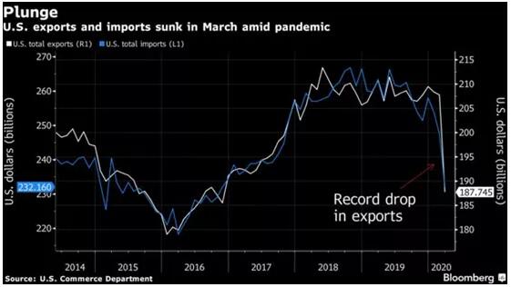 美國3月商品貿(mào)易逆差擴(kuò)大,因出口下滑抵消了進(jìn)口萎縮,表明新冠疫情正在顛覆全球商品和服務(wù)流動(dòng)。美國商務(wù)部周二公布的數(shù)據(jù)顯示,出口較前一個(gè)月下降了創(chuàng)紀(jì)錄的9.6%,至1877億美元,而進(jìn)口下降了6.2%,至2322億美元。