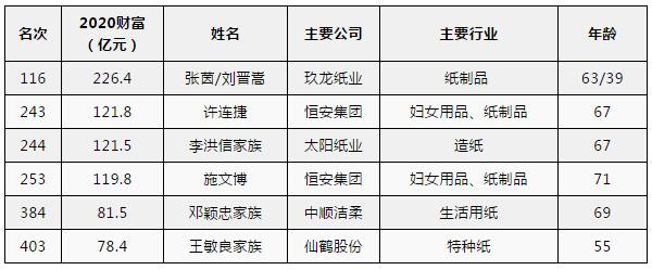 互聯網行業(yè)今年在榜單上再次大肆擴張,上榜者數量從去年的80人增加到96人,人數同比上漲20%。而傳統(tǒng)的造紙行業(yè)則只有6人(家族)入選。張茵/劉晉嵩母子以226.4億元的財富位列造紙行業(yè)第一位。