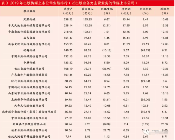 截止到2020年4月30日,20家以傳統(tǒng)出版為主業(yè)的上市公司,保持了高質(zhì)量發(fā)展的良好態(tài)勢,其資產(chǎn)規(guī)模、營收、利潤情況,見表3。其中,2019年總資產(chǎn)超過百億元的企業(yè)共10家,鳳凰傳媒、中文傳媒、中南傳媒繼續(xù)構(gòu)成“200億元陣營”。