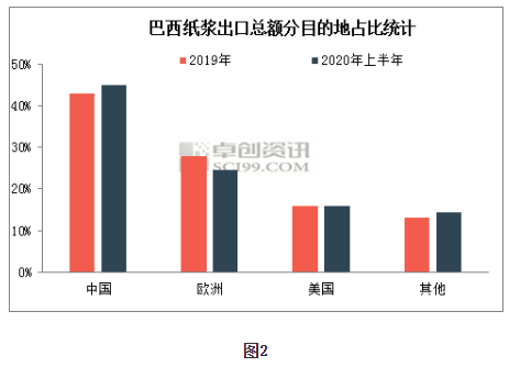 紙漿出口均價持續下行漿廠尚存利潤空間 從圖1看到,2020年上半年巴西紙漿出口量增加的同時,出口總額卻出現了下降,出口均價來到386美/噸,環比下降29%。出口均價大幅下降,漿廠生產成本是否承壓,開工積極性是否下降,造紙業者心中出現了大的疑問。而從一季度巴西主要漿廠公布的財報顯示,Suzano一季度紙漿現金生產成本596雷亞爾/噸,利潤率46%,Klabin一季度紙漿現金生產成本693雷亞爾/噸,利潤率40%,二季度數據雖尚未公布,但雷亞爾匯率持續貶值,出口優勢漸顯,短期仍有較好利潤空間,不會出現因生產成本壓力而減產的情況。綜合來看,出口均價下行降低漿廠排產積極性為“虛”,生產過程不斷優化疊加雷亞爾貶值,漿廠盈利能力較好為“實”。 歐美市場搶紙新聞頻出供應重心仍往中國傾斜
