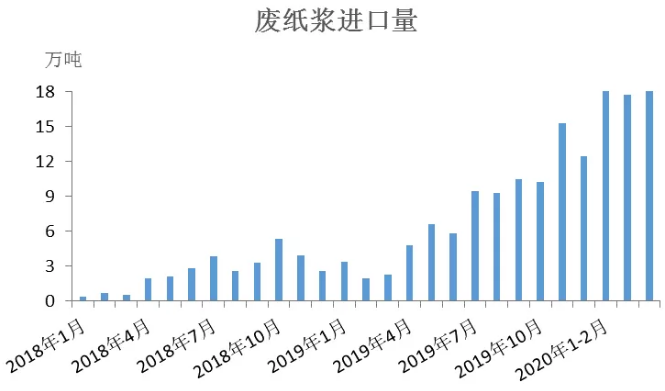 我國(guó)大規(guī)模進(jìn)口廢紙漿始于2018年,當(dāng)年全國(guó)共進(jìn)口廢紙漿在30萬(wàn)噸,到2019年,進(jìn)口量增加到92萬(wàn)噸。