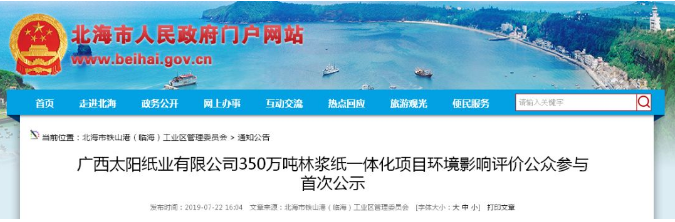 近日,北海市鐵山港(臨海)工業(yè)區(qū)管理委員會(huì)發(fā)布了“廣西太陽(yáng)紙業(yè)紙板有限公司林漿紙一體化項(xiàng)目 環(huán)境影響評(píng)價(jià)第一次公示”的公告。 根據(jù)《中華人民共和國(guó)環(huán)境影響評(píng)價(jià)法》、《環(huán)境影響評(píng)價(jià)公眾參與辦法》(生態(tài)環(huán)境部第4號(hào)令)等規(guī)定要求,現(xiàn)將廣西太陽(yáng)紙業(yè)紙板有限公司林漿紙一體化項(xiàng)目相關(guān)信息予以公示,以便了解社會(huì)公眾對(duì)本項(xiàng)目的態(tài)度以及對(duì)本項(xiàng)目環(huán)境保護(hù)方面的意見(jiàn)和建議,接受社會(huì)公眾的監(jiān)督。