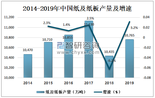 一、概況 新聞紙又稱白報(bào)紙,是報(bào)刊及書籍的主要用紙。適用于報(bào)紙、期刊、課本、連環(huán)畫等正文用紙。新聞紙的特點(diǎn)有:紙質(zhì)松輕、有較好的彈性;吸墨性能好,這就保證了油墨能較好地固著在紙面上。 含有大量的木質(zhì)素和其他雜質(zhì),不宜長期存放。保存時(shí)間過長,紙張會發(fā)黃變脆,抗水性能差,不宜書寫等。必須使用印報(bào)油墨或書籍油墨,油墨粘度不要過高,平版印刷時(shí)必須嚴(yán)格控制版面水分。由于其所用原材料以機(jī)械木漿為主,含有本質(zhì)素及雜質(zhì),所以紙張不宜長期保存,而且容易破損。2019年中國紙及紙板產(chǎn)量為10765萬噸,同比增加3.2%,其中新聞紙占比1.39%。 2014-2019年中國紙基紙板產(chǎn)量及增速