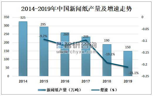 數(shù)據(jù)來源:中國造紙協(xié)會、智研咨詢整理 二、新聞紙現(xiàn)狀 1、產(chǎn)量 根據(jù)中國造紙協(xié)會數(shù)據(jù)顯示,2010-2019年我國新聞紙產(chǎn)量逐年下降。2019年,我國新聞紙產(chǎn)量僅有150萬噸,較2018年下滑21.05%。 2014-2019年中國新聞紙產(chǎn)量及增速走勢