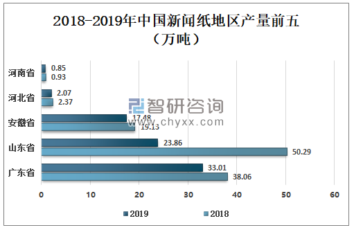 數(shù)據(jù)來源:中國造紙協(xié)會、智研咨詢整理 新聞紙是報(bào)刊及書籍的主要用紙,近年來,電子媒體盛行,報(bào)紙用紙量減少,新聞紙產(chǎn)量不復(fù)以往。2019年中國新聞紙地區(qū)產(chǎn)量排名第一帶的為廣東省38.06萬噸,第二名新聞紙產(chǎn)量為山東省23.86萬噸,第三名依舊是安徽省為17.48萬噸。 2018-2019年中國新聞紙地區(qū)產(chǎn)量前五