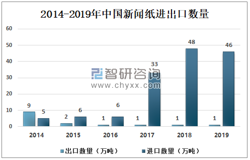 數(shù)據(jù)來源:國家統(tǒng)計(jì)局、智研咨詢整理 2、進(jìn)出口情況 由于下游市場萎靡,我國新聞紙產(chǎn)量下滑,大量產(chǎn)能退出,但剛性需求仍然存在,使得我國新聞紙進(jìn)口量大幅增長以彌補(bǔ)空缺。2019年,我國新聞紙進(jìn)口量達(dá)到46萬噸,為2010年的10倍有余。 與進(jìn)口量變化情況相反,我國新聞紙出口量近年來大幅下降。2019年,我國新聞紙出口量僅為1萬噸,與2010年的11萬噸相去甚遠(yuǎn)。 2014-2019年中國新聞紙進(jìn)出口數(shù)量