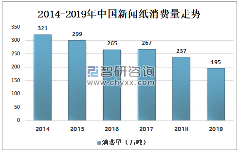 數(shù)據(jù)來源:中國海關(guān)、智研咨詢整理 3、市場需求 受下游市場消極影響,新聞紙消費(fèi)量逐年下滑,但下滑速度較產(chǎn)量下滑速度慢,整體消費(fèi)量較產(chǎn)量更高,新聞紙國內(nèi)市場出現(xiàn)輕微的供不應(yīng)求狀態(tài)。2018年,多家報(bào)刊停刊停辦,再加上由于報(bào)業(yè)廣告經(jīng)營的下滑以及發(fā)行量下降等因素,報(bào)紙出現(xiàn)減張、縮版、減量的情況,致使報(bào)業(yè)新聞紙采購量繼續(xù)下降。2019年我國新聞紙消費(fèi)量達(dá)到195萬噸,較2018年下滑17.72%,但較2019年產(chǎn)量多出30%。 2014-2019年中國新聞紙消費(fèi)量走勢