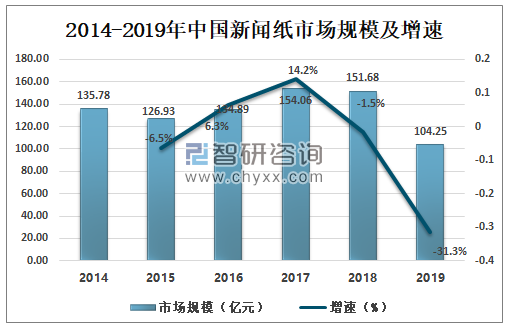數(shù)據(jù)來源:中國造紙協(xié)會、智研咨詢整理 新聞紙市場規(guī)模從2017年開始持續(xù)下降,到2019年中國新聞紙市場規(guī)模為104.25億元,比去年下降47.43億元,同比下降31.3%。 2014-2019年中國新聞紙市場規(guī)模走勢