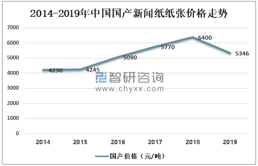 數(shù)據(jù)來源:智研咨詢整理 4、價(jià)格走勢 面對報(bào)紙用紙量減少,新聞紙市場供大于求,價(jià)格一路走低,2010-2019年,我國新聞紙價(jià)格水平在4000/噸-6500/噸之間波動,自2015年新聞紙價(jià)格不斷攀升,于2018年末達(dá)到高點(diǎn),隨后又逐漸下降。2019年,我國新聞紙價(jià)格降至5346元/噸。 2014-2019年中國國產(chǎn)新聞紙紙張價(jià)格走勢