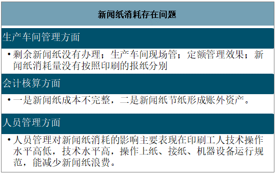 數(shù)據(jù)來源:智研咨詢整理 三、新聞紙消耗存在問題及解決方式 印刷結(jié)束后剩余新聞紙沒有辦理退庫,以新聞紙出庫量作為實(shí)際消耗量.虛增了新聞紙消耗量,易造成浪費(fèi)。 隨意印前領(lǐng)用的新聞紙由物資部提前擺放到生產(chǎn)車間、剩余新聞紙也在生產(chǎn)車間存放,生產(chǎn)車間現(xiàn)場管理的標(biāo)準(zhǔn)寬松,或者標(biāo)準(zhǔn)執(zhí)行不嚴(yán)格,地面臟亂衛(wèi)生沒有及時(shí)打掃、人員隨意進(jìn)出等,很容易造成新聞紙外皮刮擦等,形成廢紙,虛增新聞紙消耗量。 定額管理有效與否關(guān)鍵在于定額是否合理,定額制訂是需要多部門博弈、協(xié)商,受多個(gè)因素的影響.例如印量、新聞紙質(zhì)量、人員技能水平的不同都會影響定額。 新聞紙消耗存在問題