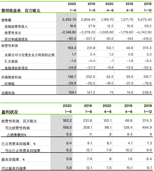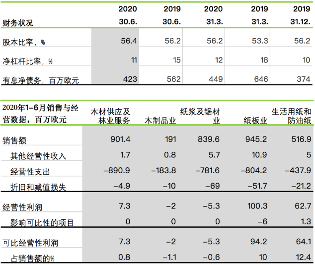 芬林集團財務報告 2020年1-6月 2020年1-6月 (與2019年1-6月相比) 銷售額為24.53億歐元(去年同期:28.09億歐元)。 經營性利潤為1.63億歐元(去年同期:2.32億歐元)。可比經營性利潤為1.58億歐元(去年同期:3.08億歐元)。 稅前利潤為1.39億歐元(去年同期:2.02億歐元)?杀榷惽袄麧櫈1.34億歐元(去年同期:2.79億歐元)。 可比已占用資本回報率為6.2%(去年同期:12.1%)。 經營現金流為2.4億歐元(去年同期:1.83億歐元)。 2020年4-6月 。ㄅc2019年4-6月相比) 銷售額為12億歐元(去年同期:13.72億歐元)。 經營性利潤為1.02億歐元(去年同期:4900萬歐元)?杀冉洜I性利潤為9600萬歐元(去年同期:1.28億歐元)。 稅前利潤為9300萬歐元(去年同期:3600萬歐元)。可比稅前利潤為8600萬歐元(去年同期:1.15億歐元)。 可比已占用資本回報率為7.6%(去年同期:10.2%)。 經營現金流為1.9億歐元(去年同期:1.42億歐元)。 2020年第二季度主要事件 與上一季度相比,長纖漿的平均美元市場價格略有上升,短纖漿的平均美元市場價格保持穩定。不過,兩種漿的價格均明顯低于去年同期。 紙板的交付量高于去年同期,價格保持相對穩定。 芬蘭凱米(Kemi)生物制品廠的前期工程項目仍在按計劃進行。環境許可申請的補充資料已于4月提交給監管當局。工廠主要設備、自動化系統、電氣系統、項目管理、實施計劃和施工已簽署初步協議。 芬蘭勞馬(Rauma)鋸木廠的土方工程已經開始。在第二季度,公司還簽署了有關主要設備、土方工程和建筑工程的協議。 由于新冠肺炎疫情大流行,工廠的年度維修停機被推遲到下半年。 新冠肺炎疫情大流行 在阻止新冠疫情大流行方面,芬林集團在運營中重點關注三個方面:所有人員的健康與安全、履行社會責任全力參與抗擊疫情、確保業務連續性。芬林集團遵循并遵守政府機構發布的新冠疫情指南。避免身體近距離接觸是最重要的預防措施。 在新冠疫情大流行期間,芬林集團的資源狀況保持正常。通過嚴格的安全措施可以防止感染鏈。除了英國的子公司、俄羅斯的Svir鋸木廠和俄羅斯的木材供應以外,其他地區的生產和交貨均保持正常。 2020年7-9月績效預測 2020年第三季度,芬林集團的可比經營性利潤預計將比2020年第二季度有所下降。