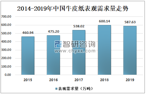 數(shù)據(jù)來源:中國海關(guān)、智研咨詢整理 隨著人們生活水平提高,對環(huán)境要求越來越高,牛皮紙需求量也隨之上漲。2019年中美貿(mào)易戰(zhàn)對整個牛皮紙產(chǎn)品鏈造成了一定的影響,使得市場上信心不足,稍微低落。2019年中國牛皮紙需求量約為587.63萬噸。 2014-2019年中國牛皮紙表觀需求量走勢