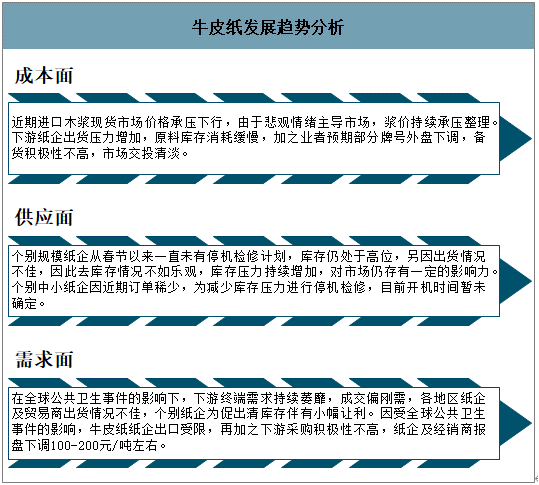 數(shù)據(jù)來源:智研咨詢整理 三、發(fā)展趨勢 從成本面來看,近期進口木漿現(xiàn)貨市場價格承壓下行,由于悲觀情緒主導(dǎo)市場,漿價持續(xù)承壓。從供應(yīng)面來看,個別規(guī)模紙企從春節(jié)以來一直未有停機檢修計劃,庫存仍處于高位,去庫存情況不容樂觀,庫存壓力持續(xù)增加,對市場仍存有一定的影響力。從需求面來看,在全球公共衛(wèi)生事件的影響下,下游終端需求持續(xù)萎靡,各地區(qū)紙企及貿(mào)易商出貨情況不佳,個別紙企為促出清庫存伴有小幅讓利。 目前國際上最流行的環(huán)保包裝材料之一,牛皮紙袋也將成為人們選擇最合適的替代品之一。 牛皮紙發(fā)展趨勢分析