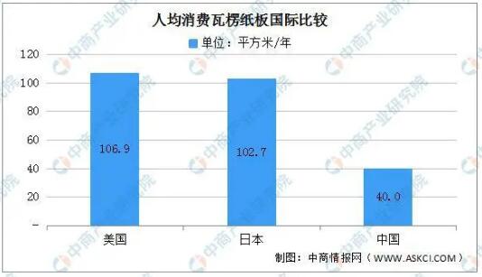 資料來(lái)源:中國(guó)包裝行業(yè)年度運(yùn)行報(bào)告(2018年度)、中商產(chǎn)業(yè)研究院整理 瓦楞紙箱行業(yè)的發(fā)展趨勢(shì) (一)我國(guó)瓦楞紙箱行業(yè)存在較大的增長(zhǎng)空間 據(jù)統(tǒng)計(jì),我國(guó)人均瓦楞紙板消費(fèi)僅為40平方米/年,遠(yuǎn)低于美國(guó)、日本等發(fā)達(dá)國(guó)家水平,未來(lái)仍存在較大的提升空間。隨著我國(guó)經(jīng)濟(jì)持續(xù)增長(zhǎng),人民生活水平及消費(fèi)能力的持續(xù)提高,以及綠色環(huán)保意識(shí)的逐步加強(qiáng),瓦楞紙箱主要面向的食品飲料、日化家化、家居辦公、家電、IT電子等行業(yè)消費(fèi)升級(jí)等因素將推動(dòng)我國(guó)對(duì)瓦楞包裝產(chǎn)品的進(jìn)一步需求。此外,電子商務(wù)等行業(yè)的持續(xù)快速發(fā)展也支撐了行業(yè)的發(fā)展。總體而言,瓦楞包裝行業(yè)前景廣闊。 (二)瓦楞紙箱行業(yè)集中度將進(jìn)一步提升 目前,我國(guó)前十大瓦楞紙箱企業(yè)合計(jì)市場(chǎng)份額低于10%,而美國(guó)前五大瓦楞紙箱企業(yè)占到國(guó)內(nèi)市場(chǎng)份額超過(guò)70%,國(guó)際間行業(yè)集中度比較的結(jié)果顯示我國(guó)瓦楞紙箱行業(yè)集中度偏低。
