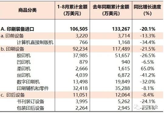 本期數(shù)據(jù)觀察 2020年1月—8月,國(guó)內(nèi)印刷品、印刷裝備、印刷器材進(jìn)出口總值較去年同期下降21.5%,與上期同比數(shù)據(jù)百分?jǐn)?shù)(-29.4%)相比減少了7.9個(gè)百分點(diǎn)。說(shuō)明國(guó)內(nèi)印刷產(chǎn)業(yè)相關(guān)商品的進(jìn)出口貿(mào)易在逐步恢復(fù)。 本期國(guó)內(nèi)印刷產(chǎn)業(yè)相關(guān)商品進(jìn)出口與去年同期進(jìn)出口同比數(shù)據(jù)的百分比差距(進(jìn)口-11.1%、出口-24.2%)表明,國(guó)內(nèi)印刷產(chǎn)業(yè)相關(guān)商品的進(jìn)口貿(mào)易恢復(fù)的狀況要好于出口貿(mào)易恢復(fù)的狀況。 本期與去年同比,進(jìn)口變化較大的前五類(lèi)商品為,柔印機(jī)(+65.0%)、絲印機(jī)(-41.2%)、計(jì)算機(jī)直接制版機(jī)(-34.4%)、數(shù)字印刷機(jī)(-32.0%)、膠印機(jī)(-26.5%);出口變化較大的前五類(lèi)商品有,其他商業(yè)印刷品(+68.2%)、辦公類(lèi)印刷品(-66.7%)、票證類(lèi)印刷品(-58.4%)、計(jì)算機(jī)直接制版機(jī)(-41.6%)、凹印機(jī)(-33.4%)。 另外,本期國(guó)內(nèi)印刷相關(guān)商品進(jìn)口由負(fù)轉(zhuǎn)正或保持正增長(zhǎng)的子項(xiàng)有,出版物印刷品(+9.3%)、柔印機(jī)(+65.0%)、黑色印刷油墨(+20.8%)和柔印版材(+1.7%);國(guó)內(nèi)印刷相關(guān)商品出口由負(fù)轉(zhuǎn)正或保持正增長(zhǎng)的子項(xiàng)有,其他商業(yè)印刷品(+68.2%)、包裝印后設(shè)備(+4.8%)。