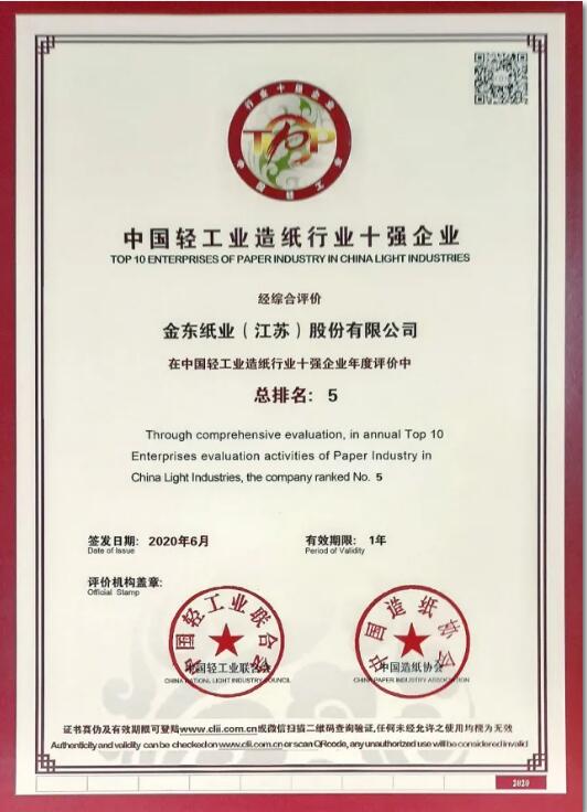 近期,中國輕工業(yè)聯(lián)合會(huì)發(fā)布“中國輕工業(yè)百強(qiáng)企業(yè)”、“中國輕工業(yè)造紙行業(yè)十強(qiáng)企業(yè)”榜單,金東紙業(yè)再次榮登中國輕工業(yè)百強(qiáng)企業(yè)排行榜, 同時(shí)榮獲“2019年度中國輕工業(yè)造紙行業(yè)十強(qiáng)企業(yè)”稱號。