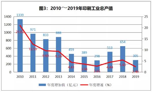 2019 年我國印刷業繼續保持平穩增長的態勢,截至2019年底,我國共有9.7萬家企業、258萬從業人員,實現總產值1.3 萬億元。 2.4%,10年來的最低速 近年來,我國印刷業增長速度逐年放緩,2012年增速跌破兩位數,達到9.60%;隨后的2013年~2015年,增速分別為9.34%、5.30%、3.60%;到2016年增速創近年新低,達到2.7%;隨后觸底反彈,2017年和2018年印刷業增速分別為4.60%和5.40%。2019年,全行業的工業總產值增速為2.4%,只能說是低速增長,這個速度也是10年來的最低速。