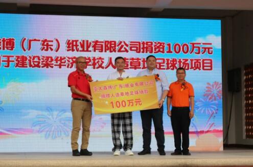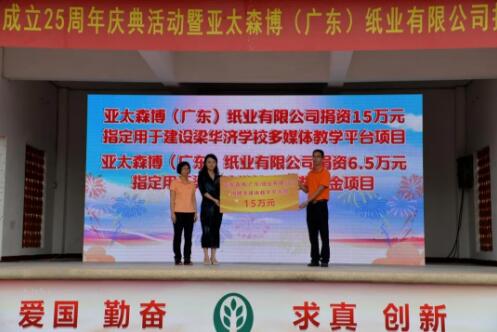 10月28日上午,梁華濟學(xué)校隆重舉行25周年慶典活動暨亞太森博(廣東)紙業(yè)有限公司捐贈儀式。亞太森博資助梁華濟學(xué)校121.5萬元,用于學(xué)校足球場、多媒體教學(xué)平臺建設(shè),以及師生們的獎學(xué)助教。新會區(qū)人大常委會黨組副書記、副主任張蓮友,雙水鎮(zhèn)黨委副書記、鎮(zhèn)長吳志斌,亞太森博總經(jīng)理洪慶隆等領(lǐng)導(dǎo)嘉賓出席活動。 本次活動得到亞太森博、梁華濟博士伉儷、雙水鎮(zhèn)教育促進(jìn)會等單位和個人的支持。亞太森博捐資100萬元用于建設(shè)梁華濟學(xué)校人造草地足球場,捐資15萬元用于建設(shè)梁華濟學(xué)校多媒體教學(xué)平臺項目,捐資6.5萬元用于梁華濟學(xué)校助學(xué)獎學(xué)金項目。梁華濟博士伉儷捐贈給梁華濟學(xué)校樓房修繕款45萬元,捐贈空調(diào)設(shè)備款25萬元,捐贈獎教獎學(xué)金20萬元,捐贈教職員工校服款10萬元。