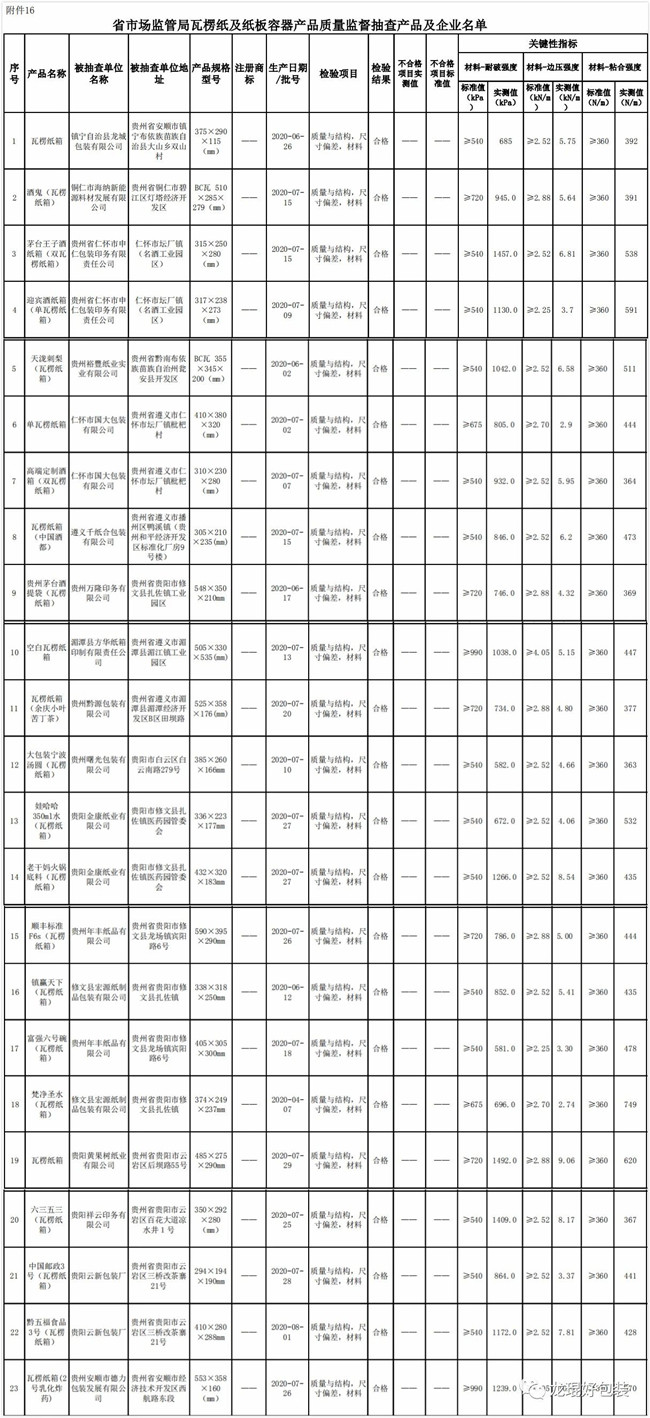 其中,在瓦楞紙箱方面,貴州省市場監(jiān)管局對17家企業(yè)生產(chǎn)的23批次瓦楞紙及紙板容器產(chǎn)品質(zhì)量開展了監(jiān)督抽查,涉及貴陽市、遵義市、安順市、銅仁市、黔南州等5個市(州)。