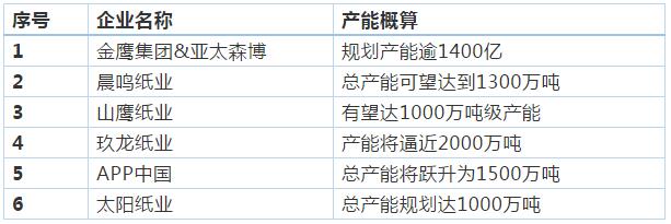 據(jù)業(yè)內(nèi)的統(tǒng)計數(shù)據(jù),2019年全國造紙企業(yè)仍然有一千多家,但實際上,造紙行業(yè)的產(chǎn)能卻越來越集中。根據(jù)包小編不完全統(tǒng)計,目前產(chǎn)能已經(jīng)達1000萬噸級,或規(guī)劃產(chǎn)能達1000萬噸級的紙業(yè)巨頭高達六家,這在全球也是絕無僅有的。 表五,國內(nèi)千萬級產(chǎn)能造紙企業(yè)一覽表