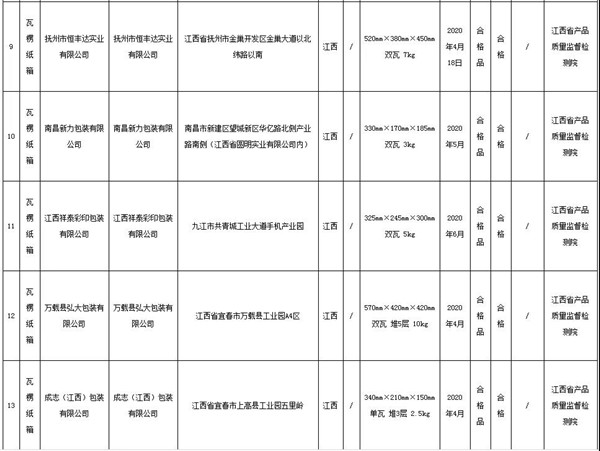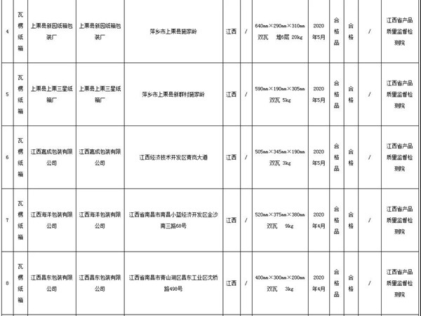 導(dǎo)語:中國質(zhì)量新聞網(wǎng)訊 據(jù)江西省市場監(jiān)督管理局網(wǎng)站2020年12月31日消息,近期,江西省市場監(jiān)督管理局對全省瓦楞紙箱產(chǎn)品質(zhì)量進行了監(jiān)督抽查。本次抽查了20批次產(chǎn)品,經(jīng)檢驗,全部合格。