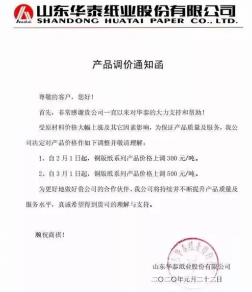 6、山東華泰紙業(yè) 受原材料價格大幅上漲及其他因素影響,為保證產品質量及服務,我公司決定對產品價格作如下調整并敬請理解: 1、自2月1日起,銅版紙系列產品價格上調300元/噸。 2、自3月1日起,銅版紙系列產品價格上調500元/噸。