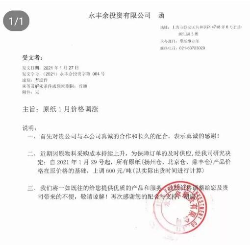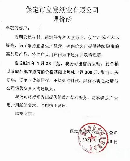 2020年12月以來,紙漿價格一路高漲,極大地增加了生活用紙市場的熱度,春節(jié)和疫情對生活用紙的影響非常大,生產(chǎn)企業(yè)們庫存消耗減少,紛紛依據(jù)行情做出漲價調整,漲價函頻頻發(fā)出,近期,又有多家企業(yè)發(fā)出漲價通知。 多家企業(yè)繼續(xù)發(fā)布漲價函 廣東信達紙業(yè):自2021年1月27日起,我司原紙每噸提價300元。 河北金博士衛(wèi)生用品:自2021年1月28日起,白色復卷用軸(含高濕強)上調300元/噸;面巾用軸上調300元/噸;本色復卷用軸上調300元/噸,本色面巾用軸上調300元/噸。 泰盛(江西)生活用品:1、自2021年2月18日起,在2月1日的價格政策基礎上上調漲400元/噸。2、自2021年3月1日起,在2月18日的價格政策基礎上上調漲300元/噸。 晨鳴集團:自2021年1月31日起,我司生活用紙原紙每噸提價200元/噸;自2021年2月18日起,我司生活用紙原紙每噸提價300元/噸; 維爾美紙業(yè)(重慶)有限公司:自2021年2月18日起,在2月1日的價格政策基礎上調400元/噸;自2021年3月1日起,在2月18日的價格政策基礎上調400元/噸;