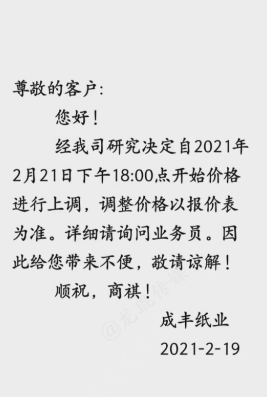 2月18日,正值業(yè)內(nèi)各大企業(yè)開工之際,新的一批原紙、紙板漲價(jià)函就已襲來。2月19日,漲價(jià)范圍逐步擴(kuò)大,各地中小型紙企紛紛跟漲,紙板、紙箱價(jià)格水漲船高。顯然,2021年春節(jié)后的第一輪漲價(jià)潮,已初具規(guī)模。 各地中小跟漲50-200元/噸 在國內(nèi)三大包裝紙龍頭中,玖龍紙業(yè)計(jì)劃2月22日上調(diào)紙價(jià),山鷹紙業(yè)已于2月18日宣布漲價(jià),理文造紙則在2月19日開始調(diào)價(jià):江西理文H紙價(jià)格上調(diào)200元/噸,B/Q紙價(jià)格上調(diào)100元/噸;江蘇理文箱板紙價(jià)格上調(diào)100元/噸。 其他大型紙廠也傳出漲價(jià)消息,如福建聯(lián)盛紙業(yè),?垵q價(jià)100-200元/噸,瓦楞紙漲價(jià)100元/噸;浙江景興紙業(yè),瓦楞紙、牛卡紙上調(diào)100元/噸;湖北金鳳凰紙業(yè),瓦楞紙上漲100元/噸;山東世紀(jì)陽光紙業(yè),白面?垵q價(jià)300元/噸,瓦楞紙上漲100元/噸…… 同時(shí),各地的中小型紙廠也紛紛發(fā)布漲價(jià)函,東莞金田紙業(yè)、中冶銀河紙業(yè)、玉田縣順發(fā)實(shí)業(yè)、棗莊華潤紙業(yè)等紙企跟漲50-200元/噸,涉及瓦楞紙、?、灰紙板等紙種。據(jù)筆者統(tǒng)計(jì),目前這輪漲價(jià)函已涵蓋浙江、廣東、福建、湖北、河北、山東、江西、江蘇等省份。 東莞市金田紙業(yè)有限公司 從2021年2月20日起,所有灰紙板產(chǎn)品在原價(jià)格基礎(chǔ)上統(tǒng)一上漲200元/噸,金娃牌環(huán)保?垺⒔鸩磁圃偕??jiān)谠瓋r(jià)格基礎(chǔ)上上漲100元/噸。  中冶銀河紙業(yè)有限公司 從2月19日起,高強(qiáng)瓦楞原紙產(chǎn)品價(jià)格在原價(jià)格基礎(chǔ)上統(tǒng)一上漲50元/噸。  玉田縣順發(fā)實(shí)業(yè)有限公司 從2021年2月19日起,所有克重及品項(xiàng)的成品紙上漲100元/噸。  棗莊華潤紙業(yè)有限公司 從2021年2月20日起,一次成型灰紙板和卷筒灰板紙?jiān)谠袃r(jià)格基礎(chǔ)上統(tǒng)一漲價(jià)200元/噸。  紙板漲價(jià)范圍逐步擴(kuò)大 2月18日,在原紙價(jià)格持續(xù)拉升的狀態(tài)下,福建福州、浙江寧波、浙江臺(tái)州等城市的紙板廠首先打響了年后的第一輪上漲。2月19日,紙板漲價(jià)范圍逐步擴(kuò)大,江西上饒、廣東揭陽、浙江金華等城市也迎來了新的紙板漲價(jià)函。 上饒市卓然實(shí)業(yè)有限公司 即日起,三層紙板上調(diào)0.05元/平方,四、五層上調(diào)0.1元/平方米,七層上漲0.15元/平方米。  磐安市宜家工貿(mào)有限公司 自2月19日17點(diǎn)開始,三層紙板上漲0.1元/平方,四層、五層上漲0.2元/平方,七層上漲0.3元/平方。加硬一層110克加0.2元/平方,加硬一層130克加0.3元/平方,加硬一層160克加0.6元/平方。  永康市星光包裝 從2月19日17點(diǎn)開始,三層紙板上調(diào)0.1元/平方,五層上漲0.2元/平方;110克加硬一層加0.2元/平方,兩層加0.4元/平方;140克加硬一層加0.3元/平方,兩層加0.6元/平方;160克加硬一層加0.55元/平方,兩層加1.1元/平方;紙板長度少于50厘米,另加0.2元/平方;紙板寬度少于20厘米,另加0.2元/平方。  成豐紙業(yè) 從2021年2月21日18點(diǎn)開始,價(jià)格上調(diào)。  盡管年前大家對(duì)年后的紙價(jià)形勢(shì)已有心理準(zhǔn)備,但原紙漲價(jià)潮真正到來的這一刻,還是會(huì)有所驚訝。尤其是對(duì)處于紙品包裝產(chǎn)業(yè)鏈最下游的紙箱廠而言,成本不斷上漲,有時(shí)根本來不及與客戶協(xié)商調(diào)價(jià),最終只能由自身承擔(dān)一部分風(fēng)險(xiǎn)。 此外,還有一個(gè)現(xiàn)象需要注意,當(dāng)前除了原紙之外,各種大宗原料基本上都保持上漲勢(shì)頭,這是否意味著,紙價(jià)上漲并非是單純的行業(yè)現(xiàn)象,而是宏觀環(huán)境下的小小縮影?