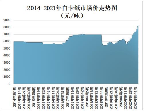 2020年8月,金光紙業完成收購博匯紙業,行業競爭格局大幅改善,供給端龍頭協同性增強。宏觀經濟復蘇,疊加灰底白產能退出、禁塑令帶來需求增量。自2020年第20周起白卡紙市場價開始穩步增長,2021年第6周白卡紙市場價為8272.5元/噸,較2020年同期增加了2062.5元/噸,近期受木漿價格上漲影響,進一步拉漲紙價。 2014-2021年白卡紙市場價走勢圖(元/噸)