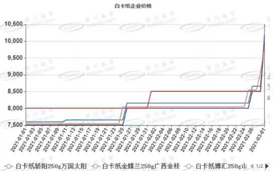 導(dǎo)語:漿價(jià)和紙價(jià)還要漲到什么時(shí)候呢?有分析師預(yù)測針葉漿的下一個(gè)目標(biāo)將是8000元,而紙價(jià)隨著特種紙全面過萬元之后,已經(jīng)站穩(wěn)8000元的白卡紙也將向萬元的歷史高位沖擊! 1、一天之內(nèi),國內(nèi)白卡紙價(jià)格突破萬元大關(guān) 3月1日,白卡紙市場突然發(fā)力漲價(jià),APP金桂和寧波中華紙業(yè)漲價(jià)1800元/噸,博匯紙業(yè)漲價(jià)1000元/噸,其他白卡紙生產(chǎn)企業(yè)紛紛跟漲1000元/噸,一天的時(shí)間,國內(nèi)白卡紙價(jià)格即突破了萬元大關(guān)。 1、湛江晨鳴、山東晨鳴白卡漲1000元/噸 2、山東博匯、江蘇博匯白卡漲1000元/噸 3、萬國紙業(yè)白卡漲1000元/噸 4、新鄉(xiāng)新亞紙業(yè)白卡漲1000元/噸 5、廣西金桂紙業(yè)白卡漲1800元/噸 6、寧波中華紙業(yè)白卡漲1800元/噸 回顧本輪漲價(jià)來看:1月下旬,APP、晨鳴、博匯、太陽主力紙廠發(fā)布2、3月漲價(jià)函。宣布2月、3月接單價(jià)格分別提漲500元/噸。春節(jié)前,2月漲價(jià)如期落實(shí),白卡紙價(jià)格站穩(wěn)8000元線。春節(jié)后,隨著紙漿價(jià)格一路走高,造紙系列產(chǎn)品全線拉漲。白卡紙?jiān)竟⿷?yīng)緊張,加之3月漲價(jià)500元的通知已發(fā),中下游節(jié)后備貨積極,紙廠門口排隊(duì)現(xiàn)象嚴(yán)重。春節(jié)期間累積的庫存迅速降至低位,個(gè)別紙廠表示近期一直無庫存。2月中下旬紙廠報(bào)價(jià)維持月初訂單價(jià)格,貿(mào)易商方面率先拉漲市場成交價(jià)格500-800元/噸,截止2月23日,白卡紙市場主流成交價(jià)格漲至8700-8800元/噸。 2月25日開始,紙廠方面陸續(xù)開始接3月新單,簽單價(jià)格較前期提漲500元/噸。周末至今,幾大紙廠陸續(xù)追漲兩次,漲幅分別是500元和800元/噸。截止發(fā)稿,3月較2月接單價(jià)格漲幅由原定的500元/噸擴(kuò)大到1800元/噸附近。自此主流品牌白卡紙報(bào)價(jià)達(dá)到10000元/噸。