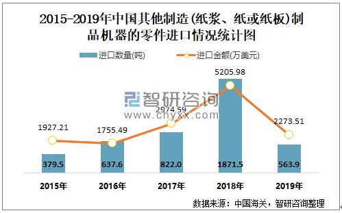 根據中國海關數據顯示:2019年1-12月中國其他制造(紙漿、紙或紙板)制品機器的零件進口數量為563.89噸,進口金額為2273.51萬美元;2019年1-12月其他制造(紙漿、紙或紙板)制品機器的零件出口數量為9820.33噸,出口金額為9051.91萬美元。