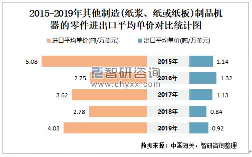 2015-2019年中國其他制造(紙漿、紙或紙板)制品機器的零件進出口平均單價對比統計圖