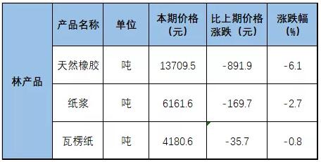 其中林產品領域,3月下旬與3月中旬相比,紙漿價格下跌169.7元,跌幅2.7%;瓦楞紙價格下跌35.7元,跌幅0.8%。