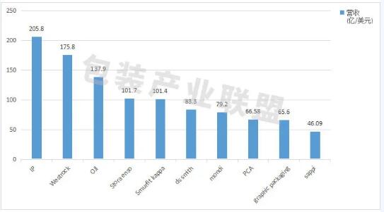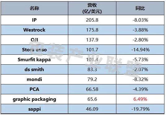 位居榜首的仍然是美國紙包裝龍頭——國際紙業(IP),年營收205.8億美元,相比去年略微有所下降。Westrock、oji、Stora enso、smurfit kappa分別位列第二、三、四、五名,全年營收分別為175.8億美元、137.9億美元、101.7億美元、101.4億美元,也是榜上年營收上百億美元的五家企業。