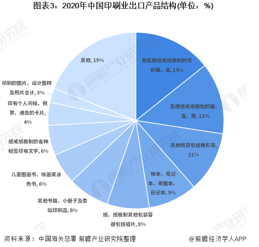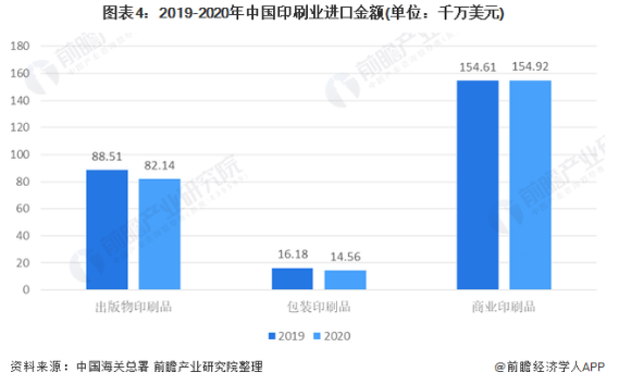2020年我國印刷品進口金額為25.16億美元,出口金額為115.83億美元,商業印刷品和出版物印刷品是國內印刷品進口的主要商品,包裝印刷品和商業印刷品是國內印刷品出口的主力。 2020年我國印刷品出口是進口的4.60倍 2020年我國印刷品進出口總額為140.99億美元,較去年同期減少22.24億美元,同比下降13.62%;其中進口額為25.16億美元,出口額為115.83億美元,貿易差額為90.67億美元。  包裝印刷品為印刷行業出口主要產品 2020年國內印刷品出口115.83億美元。其中,出版物印刷品出口15.65億美元、包裝印刷品出口54.57億美元、商業印刷品出口45.61億美元。出版物印刷品、包裝印刷品和商業印刷品出口占國內印刷品出口總值的比重分別為14%、47%和39%。  按照進出口金額大小排序,2020年國內印刷品出口前10位的商品是非瓦楞紙或紙板制的可折疊箱/盒、瓦楞紙或紙板制的箱/盒、紙袋、本冊等,其出口占國內印刷品出口總值的81%。  商業印刷品為印刷業主要進口產品 2020年國內印刷品進口25.16億美元。從進出口結構看,2020年國內印刷品進口,出版物印刷品、包裝印刷品和商業印刷品進口占印刷品進口總值的比重分別為,33%、6%和61%。商業印刷品和出版物印刷品是國內印刷品進口的主要商品。  按照進出口金額大小排序,2020年國內進口前10位的商品是票證、書籍、期刊、紙質的其他印刷品、貼花、標簽等,這10種商品進口占國內印刷品進口總值的93%。