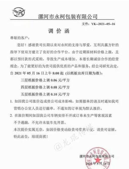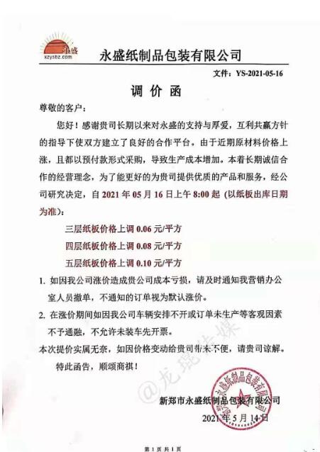 5月14日晚間,玖龍紙業再度傳出漲價的消息:自5月17日起,玖海牛上漲100元/噸,地龍牛卡、地龍再生、江龍再生牛卡上漲50元/噸。這是玖龍紙業在本月啟動的第三輪上漲,距離第一輪漲價,時間僅相差不過一周時間。 實際上,近期乃至今年以來,不止是原紙價格,銅、鋁材、鋼鐵、玻璃、塑料等大宗商品價格均迎來長時間上調。其中一個重要原因便是,美國采取量化寬松的經濟刺激政策,瘋狂加印鈔票。因為美元是世界貨幣,很快就能流通全世界。貨幣一旦增發,物價必然上漲。 而對于包裝印刷業而言,紙價的上漲,無疑令其成本急劇增加。5月14日-5月16日,伴隨著玖龍原紙漲價的消息,廣東、河北、重慶、四川、江蘇、安徽等省市紙板市場也迎來了新一輪漲價,其中不少紙板廠已是第二輪上漲。 最新的紙板漲價函 漯河市永柯包裝有限公司 從2021年5月16日上午8點開始,三層紙板價格上漲0.06元/平方,四層紙板價格上漲0.08元/平方,五層紙板價格上漲0.10元/平方。  永盛紙制品包裝有限公司 從2021年5月16日上午8點開始,三層紙板價格上漲0.06元/平方,四層紙板價格上漲0.08元/平方,五層紙板價格上漲0.10元/平方。  鄭州華強紙制品包裝有限公司 從2021年5月16日上午8點開始,三層紙板價格上漲0.06元/平方,四層紙板價格上漲0.08元/平方,五層紙板價格上漲0.10元/平方。