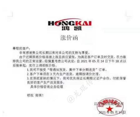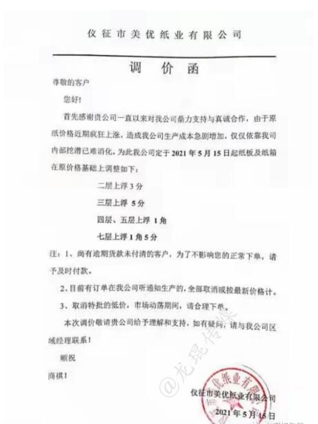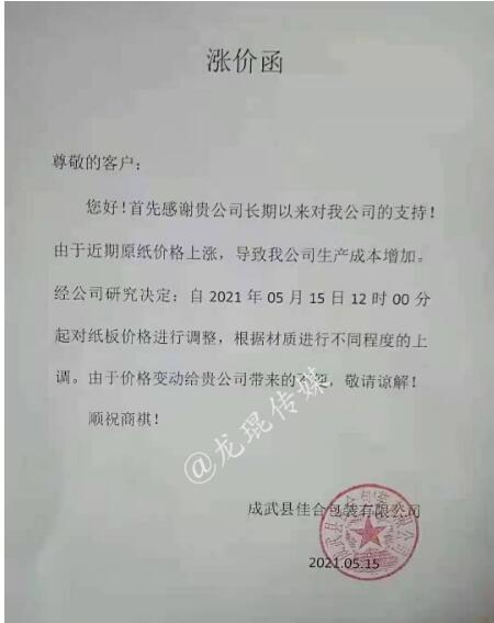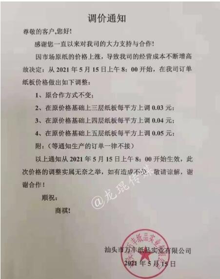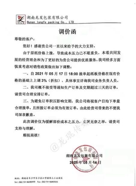 湖南龍發包裝有限公司 從2021年5月17日上午18點開始,紙板價格在現有價格基礎上上漲3%。  汕頭市萬豐紙品實業有限公司 從2021年5月15日上午8點開始,三層紙板每平方上漲0.03元/平方,四層紙板每平方上漲0.04元/平方,五層紙板每平方上漲0.05元/平方。
