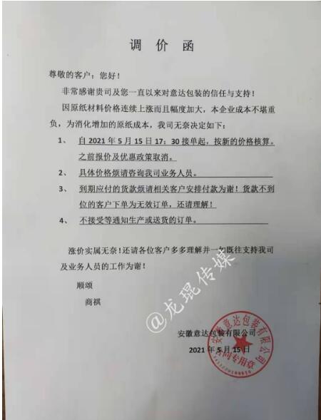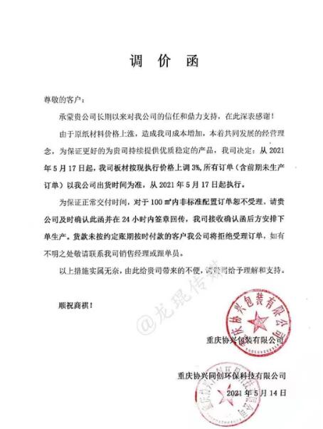 瀘州市一圣鴻包裝有限公司 從2021年5月17日起,按現執行價格上漲3%。  重慶協興包裝有限公司 從2021年5月17日起,板材現價格在執行價格基礎上上漲3%。