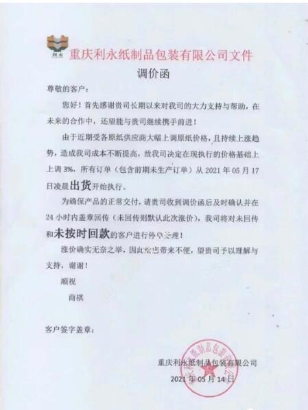 重慶利永紙制品包裝有限公司 從2021年5月17日起,在現執行價格基礎上上漲3%。