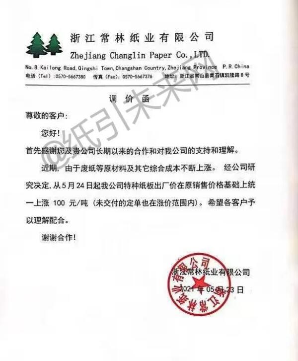 常林紙業有限公司:近期,由于廢紙等原材料及其它綜合成本不斷上漲。經公司研究決定,從5月24日起我公司特種紙板出廠價在原銷售價格基礎上統一上漲100元/噸(未交付的定單也在漲價范圍內)。