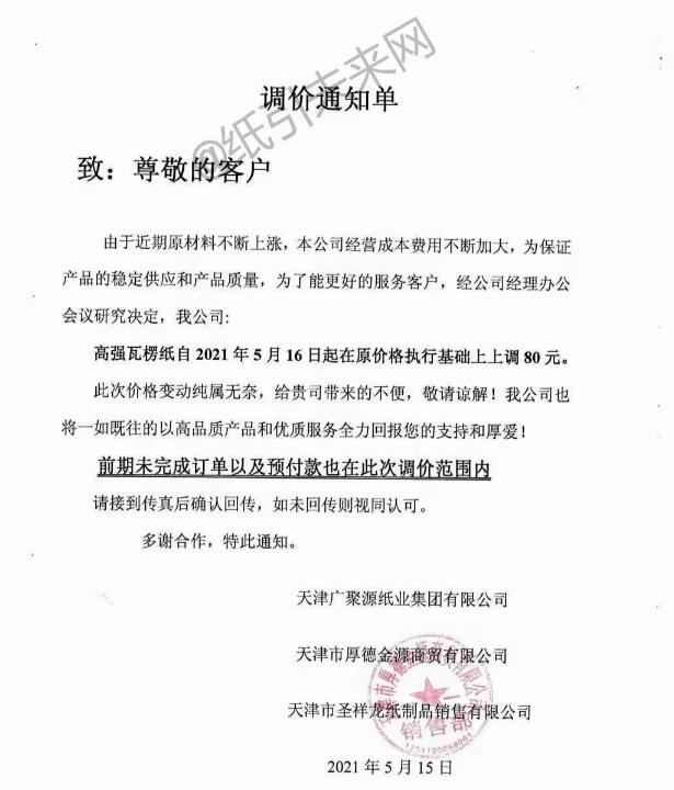 天津廣聚源紙業集團有限公司:由于近期原材料不斷上漲,本公司經營成本費用不斷加大,我公司∶高強瓦楞紙自2021年5月16日起在原價格執行基礎上上調80元。