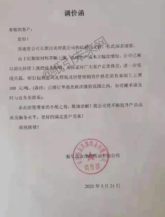 秦是島金茂源紙業限公司:由于近期原材料不斷上漲,造成生產成本大幅度增加,即日起我公司瓦楞紙及紗管紙銷售價格在原有基礎上上調100元/噸。(備注∶已接訂單也在此次漲價范圍之內,如有撤單請及時與業務員聯系)。