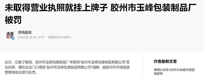 近日,記者了解到,膠州市玉峰包裝制品廠未取得“膠州市玉峰包裝制品有限公司”營業執照,便在企業門口懸掛“膠州市玉峰包裝制品有限公司”銅牌,被膠州市市場監督管理局依法進行處罰。