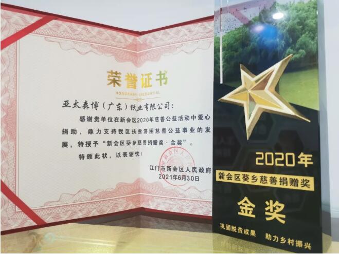 6月30日,江門市新會區(qū)舉行2021年“廣東扶貧濟(jì)困日”活動,亞太森博(廣東)紙業(yè)有限公司在大會上被授予“新會區(qū)葵鄉(xiāng)慈善捐贈金獎”,亞太森博副總經(jīng)理?xiàng)顨g作為企業(yè)代表上臺接受頒獎。區(qū)委書記文彥,新會區(qū)委副書記、區(qū)長林錫波,區(qū)人大常委會黨組書記、主任梁遠(yuǎn)球,區(qū)政協(xié)黨組書記、主席林社攸等區(qū)四套班子成員出席活動。