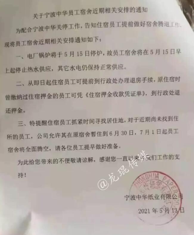然而由于城市發(fā)展以及環(huán)保原因,當(dāng)?shù)卣缭?018年便將“寧波中華紙業(yè)關(guān)閉”列入推進(jìn)“三江六岸”年度工作計(jì)劃。今年6月份,一份《關(guān)于寧波中華員工宿舍近期相關(guān)安排的通知》發(fā)布,宣告寧波中華紙業(yè)正式退出寧波市海曙區(qū)。