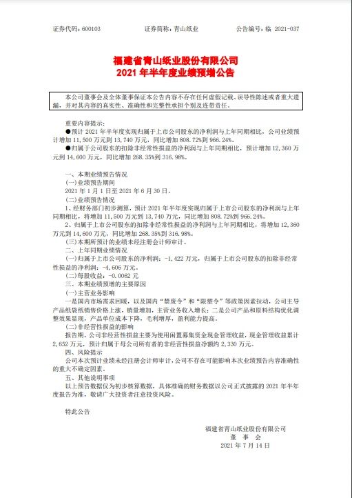 7月14日,青山紙業(yè)(600103)發(fā)布2021年半年度業(yè)績預告:預計2021年半年度實現(xiàn)歸屬于上市公司股東的凈利潤與上年同期相比,將增加11,500萬元到13,740萬元,同比增加808.72%到966.24%。