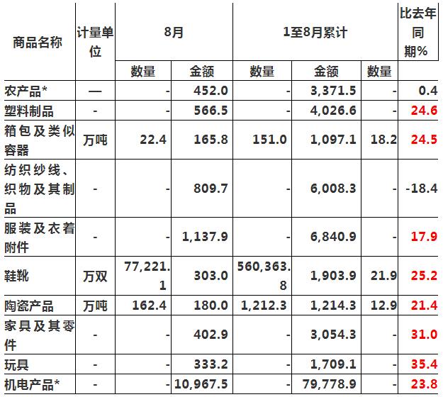 中國海關8月份進出口數據業已出爐,一些包裝訂單息息相關的出口商品數據,值得我們關注。