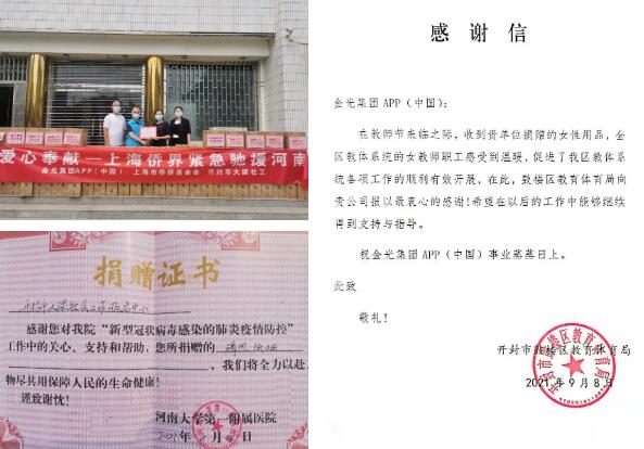 近三十年來(lái),伴隨著金光集團(tuán)APP在中國(guó)的發(fā)展,黃總裁總是帶領(lǐng)金光人在祖國(guó)最需要援助的時(shí)刻,帶著赤誠(chéng)的愛(ài)國(guó)之心,一次又一次地踐行使命與承諾。截至目前,金光集團(tuán)和黃奕聰慈善基金會(huì)在國(guó)內(nèi)的公益捐贈(zèng)累計(jì)已超過(guò)12億元人民幣。 中原暴雨 義不容辭 前不久,罕見(jiàn)暴雨突襲河南,汛情牽動(dòng)全國(guó)人民的心。眼見(jiàn)救援刻不容緩,受災(zāi)群眾生活物資的缺乏也是燃眉之急。 黃志源總裁在了解到汛情給河南人民帶去諸多生活不便與困難后,當(dāng)即決定第一時(shí)間通過(guò)上海市華僑事業(yè)發(fā)展基金會(huì)捐贈(zèng)一批價(jià)值近1000萬(wàn)元的物資,包含紙巾、消毒濕巾、衛(wèi)生巾等生活用品,力求保障受災(zāi)人民的基本生活需求,成為此次河南汛情中首家捐贈(zèng)的僑資企業(yè)。